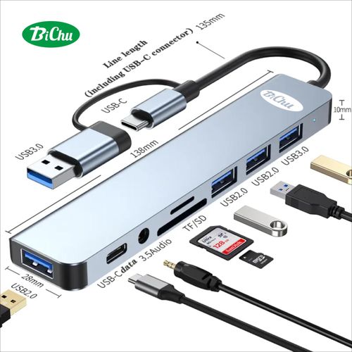 Product details1、8 in 1 multi-function adapter: TPYE-C + USB3.0 + SD/TF card slot + 3.5mm interface, 5Gbps high-speed data transmission.2、1 USB3.0+3 USB2.0+TF card reader/SD card reader+3.5mm port+Type-C port.
